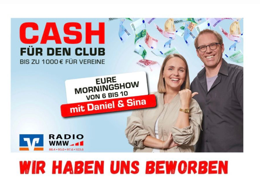 Der DTK Westmünsterland e.V. macht in diesem Jahr wieder beim beliebten Radiogewinnspiel „Cash für den Club“ von Radio WMW mit. Dabei können wir als Verein bis zu 1.000 Euro gewinnen, und dafür brauchen wir die Unterstützung unserer Mitglieder, Freunde und Hörerinnen und Hörer im Westmünsterland.